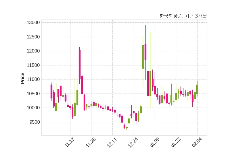 한편, 한국화장품은 장 마감 이후 해당 기업공시를 발표했으며 오늘 종가가 10,810원, 거래량은 797,431주로, 직전 거래일 대비 270원(+2.56%) 상승했다.