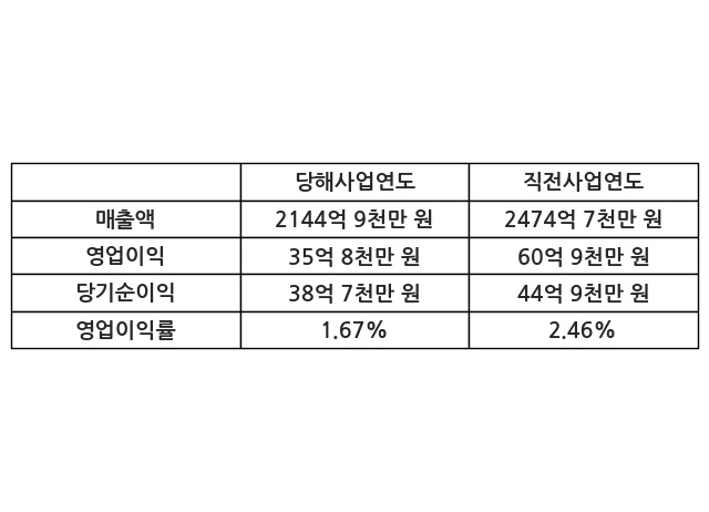 이번사업연도의 매출액은 직전사업연도 대비 -13.33% 감소한 2144억 9천만 원, 영업이익은 35억 8천만 원, 당기순이익은 38억 7천만 원이라고 공시했다.