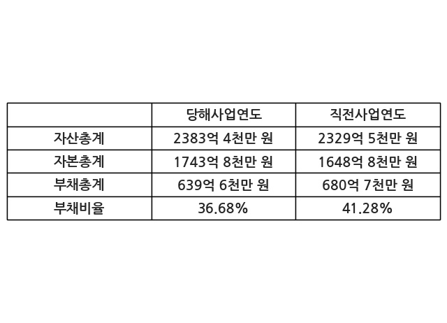 또한, 이번사업연도의 자산총계는 2383억 4천만 원으로 직전사업연도 대비 2.32% 증가한 한편, 부채총계는 639억 6천만 원으로 -6.04% 감소, 자본총계는 1743억 8천만 원으로 5.76% 증가했다.