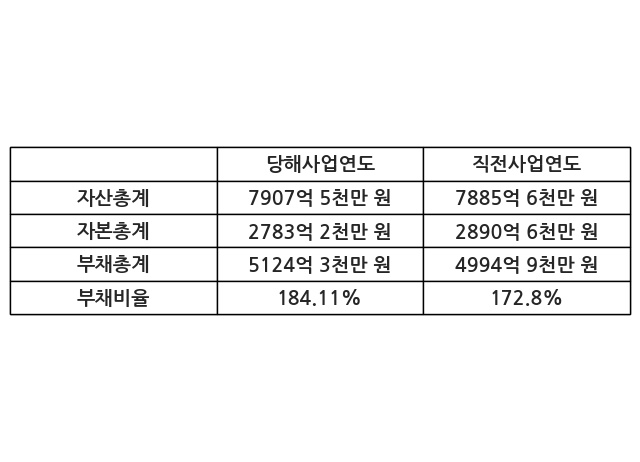 또한, 이번사업연도의 자산총계는 7907억 5천만 원으로 직전사업연도 대비 0.28% 증가한 한편, 부채총계는 5124억 3천만 원으로 2.59% 증가, 자본총계는 2783억 2천만 원으로 -3.72% 감소했다.