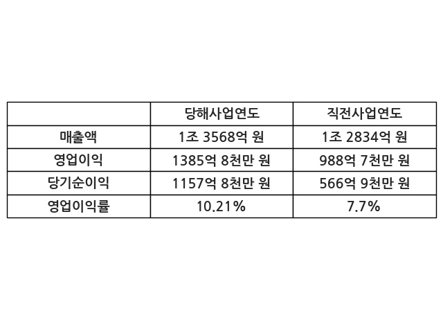 이번사업연도의 매출액은 직전사업연도 대비 5.72% 증가한 1조 3568억 원, 영업이익은 1385억 8천만 원, 당기순이익은 1157억 8천만 원이라고 공시했다.