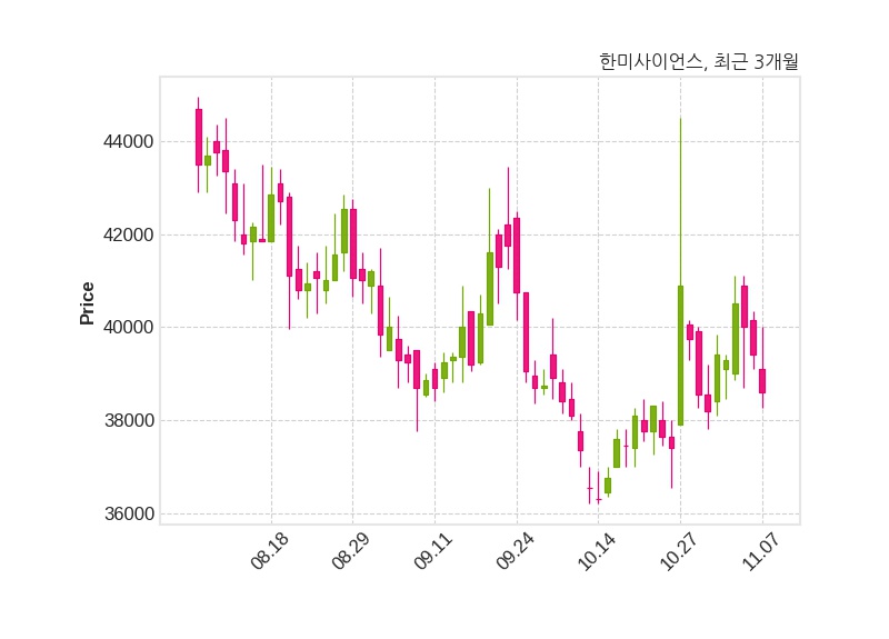 한편, 한미사이언스의 12시 43분 현재주가는 38,600원으로 직전 거래일 대비 800원(-2.03%) 하락이며, 거래량은 64,673주이다.