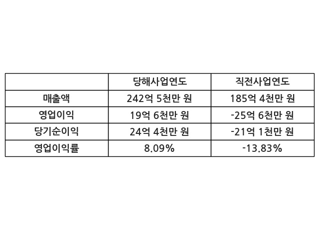 이번사업연도의 매출액은 직전사업연도 대비 30.76% 증가한 242억 5천만 원, 영업이익은 19억 6천만 원, 당기순이익은 24억 4천만 원이라고 공시했다.