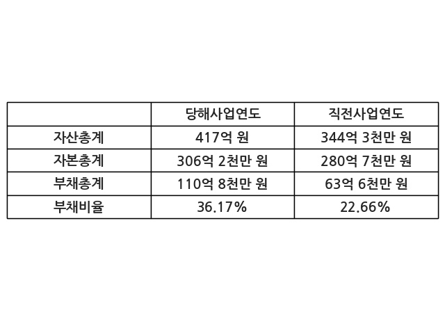 또한, 이번사업연도의 자산총계는 417억 원으로 직전사업연도 대비 21.1% 증가한 한편, 부채총계는 110억 8천만 원으로 74.15% 증가, 자본총계는 306억 2천만 원으로 9.08% 증가했다.