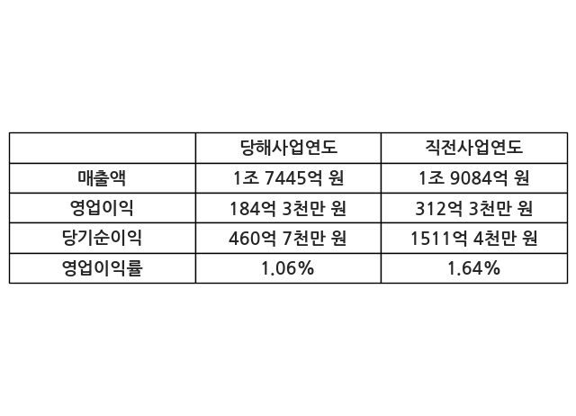 이번사업연도의 매출액은 직전사업연도 대비 -8.59% 감소한 1조 7445억 원, 영업이익은 184억 3천만 원, 당기순이익은 460억 7천만 원이라고 공시했다.