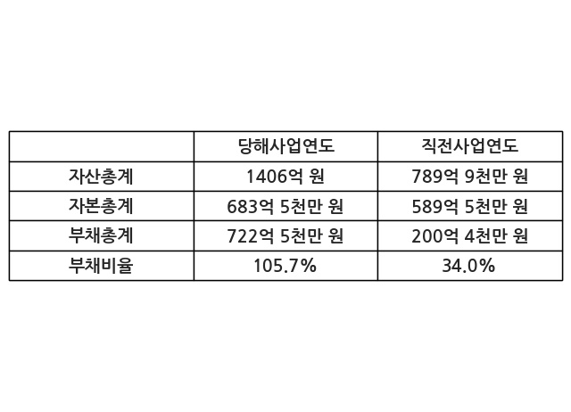 또한, 이번사업연도의 자산총계는 1406억 원으로 직전사업연도 대비 78.0% 증가한 한편, 부채총계는 722억 5천만 원으로 260.5% 증가, 자본총계는 683억 5천만 원으로 15.95% 증가했다.