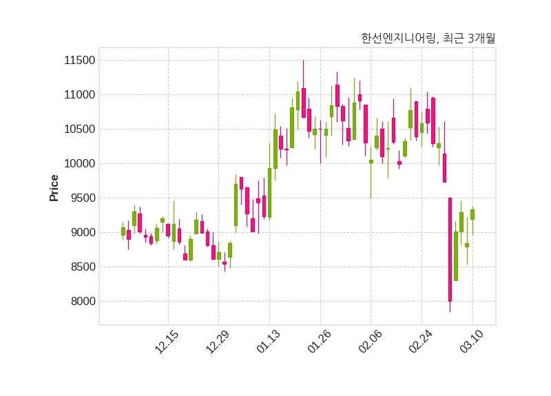 한선엔지니어링은 특별관계자 대신증권의 지분율이 11.27%에서 12.88%로 변동했다고 10일 공시했다. 한편, 한선엔지니어링의 13시 40분 현재주가는 9,330원으로 직전 거래일 대비 490원(+5.54%) 상승이며, 거래량은 101,348주이다.
