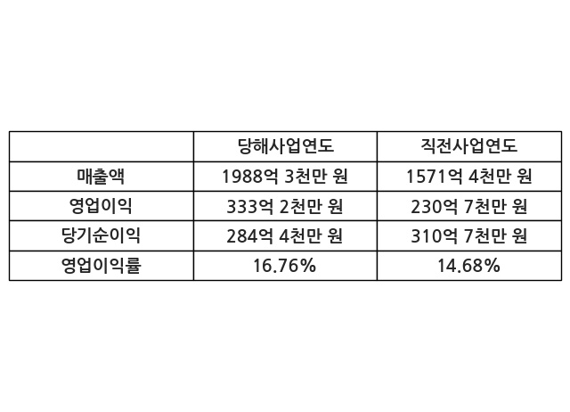 이번사업연도의 매출액은 직전사업연도 대비 26.53% 증가한 1988억 3천만 원, 영업이익은 333억 2천만 원, 당기순이익은 284억 4천만 원이라고 공시했다.