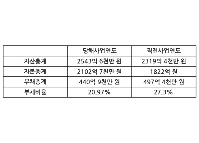 또한, 이번사업연도의 자산총계는 2543억 6천만 원으로 직전사업연도 대비 9.67% 증가한 한편, 부채총계는 440억 9천만 원으로 -11.36% 감소, 자본총계는 2102억 7천만 원으로 15.41% 증가했다.