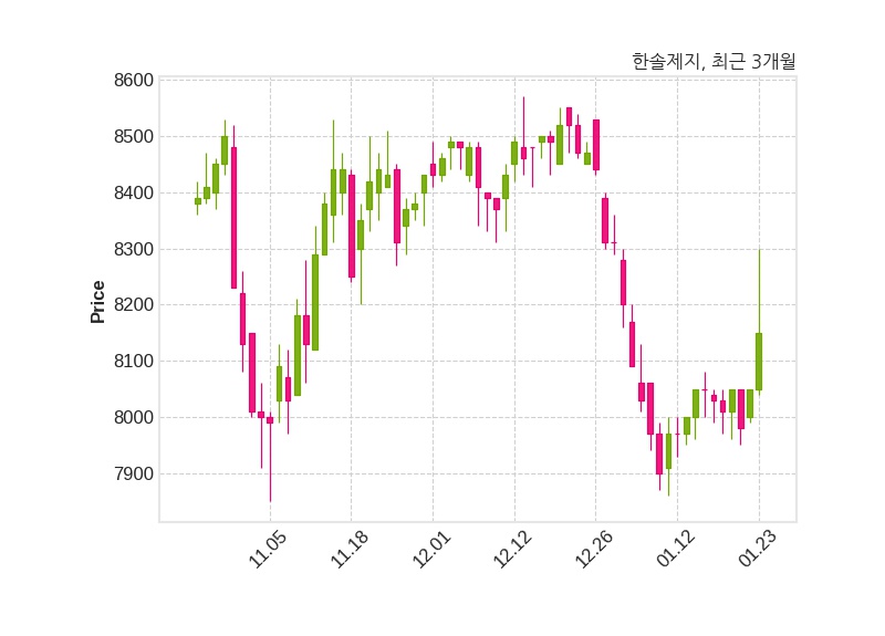 한편, 한솔제지의 10시 36분 현재주가는 8,150원으로 직전 거래일 대비 100원(+1.24%) 상승이며, 거래량은 38,360주이다.