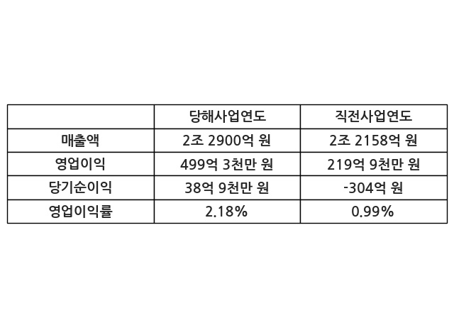 이번사업연도의 매출액은 직전사업연도 대비 3.35% 증가한 2조 2900억 원, 영업이익은 499억 3천만 원, 당기순이익은 38억 9천만 원이라고 공시했다.