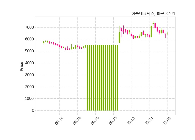 한편, 한솔테크닉스는 장 마감 이후 해당 기업공시를 발표했으며 오늘 종가가 6,460원, 거래량은 209,323주로, 직전 거래일 대비 40원(+0.62%) 상승했다.