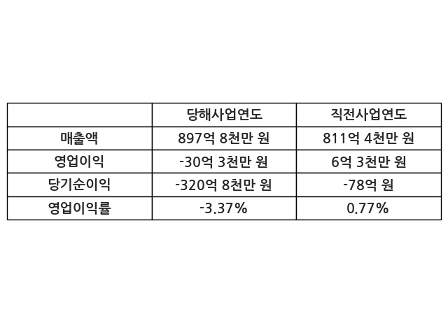 이번사업연도의 매출액은 직전사업연도 대비 10.65% 증가한 897억 8천만 원, 영업이익은 -30억 3천만 원, 당기순이익은 -320억 8천만 원이라고 공시했다.