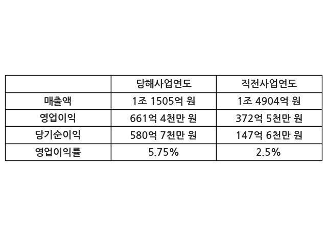 이번사업연도의 매출액은 직전사업연도 대비 -22.81% 감소한 1조 1505억 원, 영업이익은 661억 4천만 원, 당기순이익은 580억 7천만 원이라고 공시했다.
