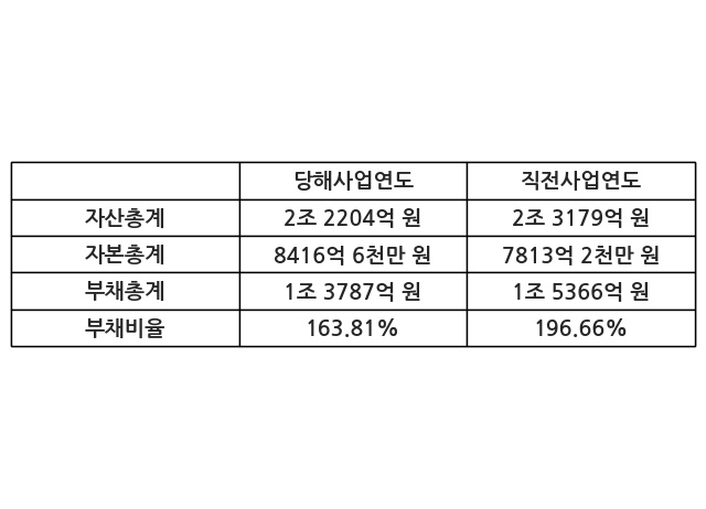 또한, 이번사업연도의 자산총계는 2조 2204억 원으로 직전사업연도 대비 -4.21% 감소한 한편, 부채총계는 1조 3787억 원으로 -10.27% 감소, 자본총계는 8416억 6천만 원으로 7.72% 증가했다.