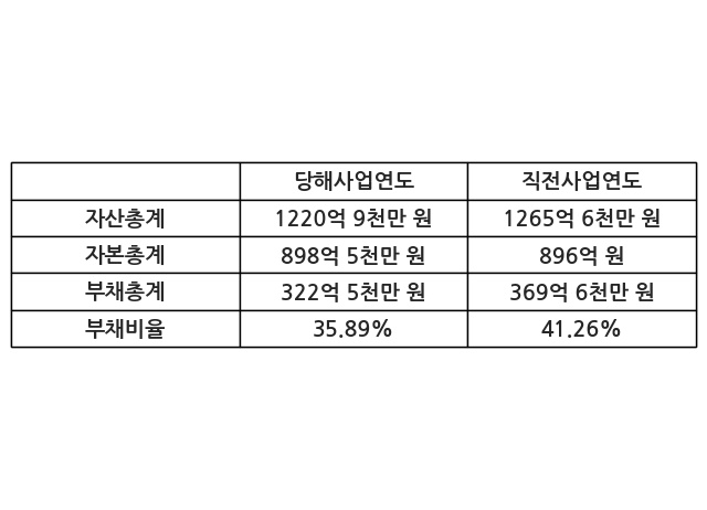 또한, 이번사업연도의 자산총계는 1220억 9천만 원으로 직전사업연도 대비 -3.53% 감소한 한편, 부채총계는 322억 5천만 원으로 -12.76% 감소, 자본총계는 898억 5천만 원으로 0.28% 증가했다.