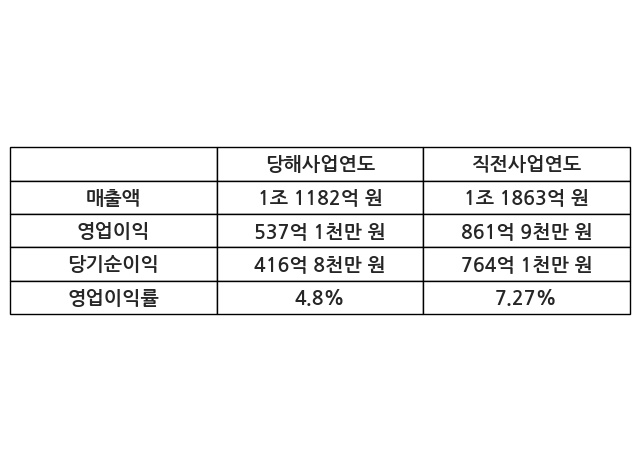 이번사업연도의 매출액은 직전사업연도 대비 -5.74% 감소한 1조 1182억 원, 영업이익은 537억 1천만 원, 당기순이익은 416억 8천만 원이라고 공시했다.