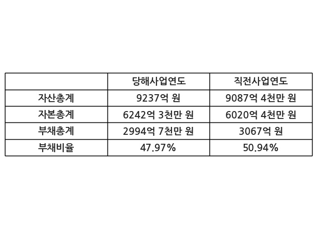 또한, 이번사업연도의 자산총계는 9237억 원으로 직전사업연도 대비 1.65% 증가한 한편, 부채총계는 2994억 7천만 원으로 -2.36% 감소, 자본총계는 6242억 3천만 원으로 3.69% 증가했다.