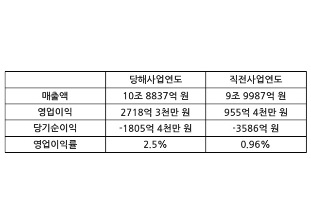 이번사업연도의 매출액은 직전사업연도 대비 8.85% 증가한 10조 8837억 원, 영업이익은 2718억 3천만 원, 당기순이익은 -1805억 4천만 원이라고 공시했다.