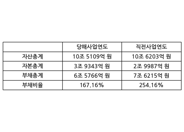 또한, 이번사업연도의 자산총계는 10조 5109억 원으로 직전사업연도 대비 -1.03% 감소한 한편, 부채총계는 6조 5766억 원으로 -13.71% 감소, 자본총계는 3조 9343억 원으로 31.2% 증가했다.