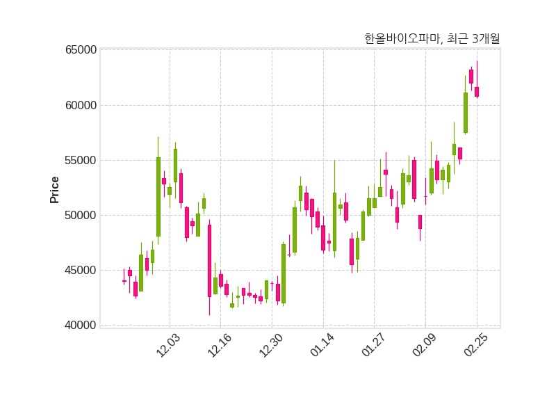한편, 한올바이오파마는 장 마감 이후 해당 기업공시를 발표했으며 오늘 종가가 60,800원, 거래량은 386,212주로, 직전 거래일 대비 1,200원(-1.94%) 하락했다.