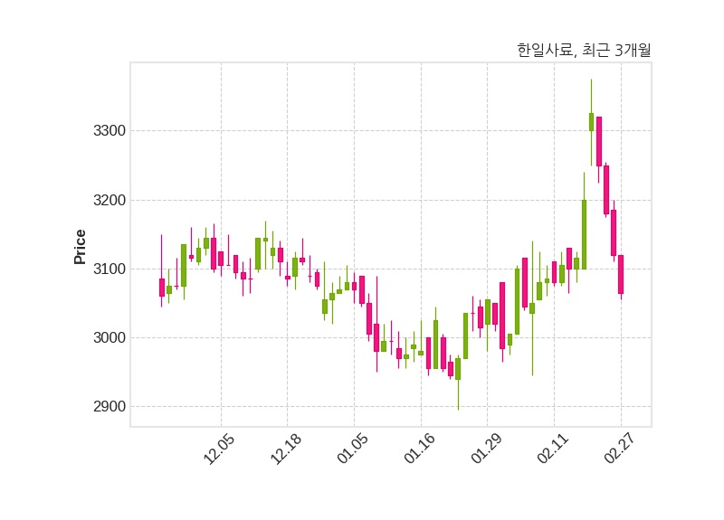 한편, 한일사료는 장 마감 이후 해당 기업공시를 발표했으며 오늘 종가가 3,065원, 거래량은 335,566주로, 직전 거래일 대비 55원(-1.76%) 하락했다.