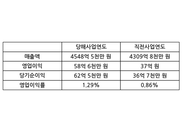 이번사업연도의 매출액은 직전사업연도 대비 5.54% 증가한 4548억 5천만 원, 영업이익은 58억 6천만 원, 당기순이익은 62억 5천만 원이라고 공시했다.