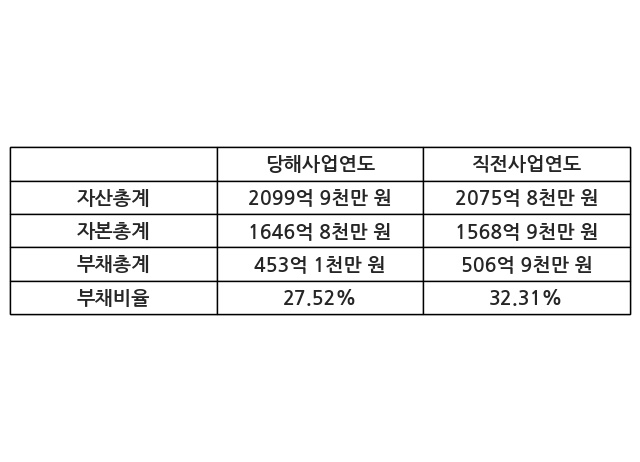 또한, 이번사업연도의 자산총계는 2099억 9천만 원으로 직전사업연도 대비 1.16% 증가한 한편, 부채총계는 453억 1천만 원으로 -10.61% 감소, 자본총계는 1646억 8천만 원으로 4.96% 증가했다.