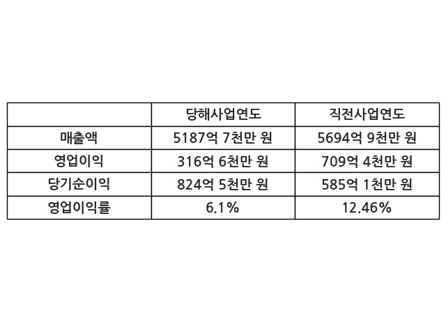이번사업연도의 매출액은 직전사업연도 대비 -8.91% 감소한 5187억 7천만 원, 영업이익은 316억 6천만 원, 당기순이익은 824억 5천만 원이라고 공시했다.