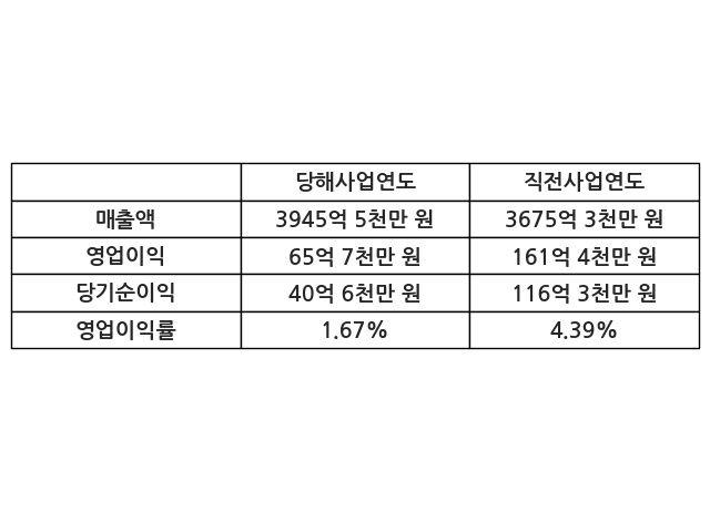 이번사업연도의 매출액은 직전사업연도 대비 7.35% 증가한 3945억 5천만 원, 영업이익은 65억 7천만 원, 당기순이익은 40억 6천만 원이라고 공시했다.