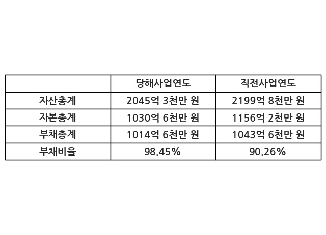 또한, 이번사업연도의 자산총계는 2045억 3천만 원으로 직전사업연도 대비 -7.03% 감소한 한편, 부채총계는 1014억 6천만 원으로 -2.78% 감소, 자본총계는 1030억 6천만 원으로 -10.86% 감소했다.