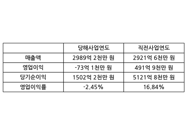 이번사업연도의 매출액은 직전사업연도 대비 2.32% 증가한 2989억 2천만 원, 영업이익은 -73억 1천만 원, 당기순이익은 1502억 2천만 원이라고 공시했다.
