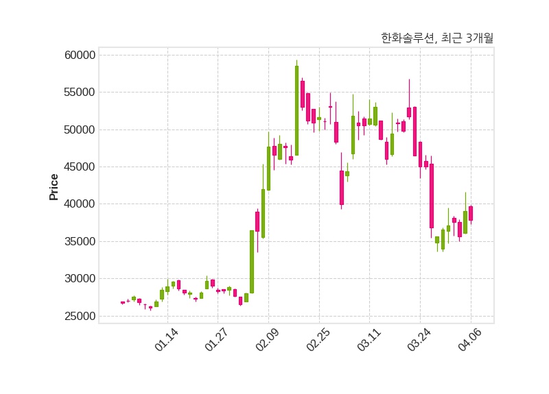 한편, 한화솔루션의 09시 49분 현재주가는 37,850원으로 직전 거래일 대비 1,200원(-3.07%) 하락이며, 거래량은 1,325,658주이다.