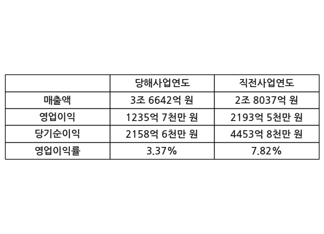이번사업연도의 매출액은 직전사업연도 대비 30.69% 증가한 3조 6642억 원, 영업이익은 1235억 7천만 원, 당기순이익은 2158억 6천만 원이라고 공시했다.