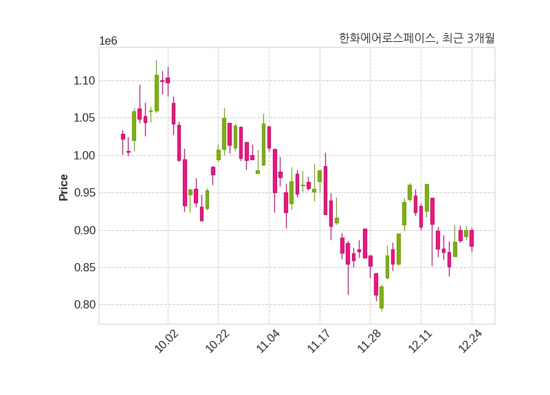 한편, 한화에어로스페이스는 장 마감 이후 해당 기업공시를 발표했으며 오늘 종가가 878,000원, 거래량은 97,539주로, 직전 거래일 대비 22,000원(-2.44%) 하락했다.