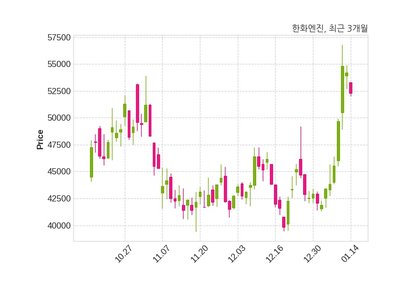 한편, 한화엔진의 09시 08분 현재주가는 52,300원으로 직전 거래일 대비 1,900원(-3.51%) 하락이며, 거래량은 67,821주이다.