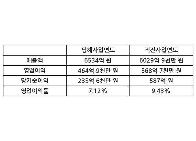 이번사업연도의 매출액은 직전사업연도 대비 8.36% 증가한 6534억 원, 영업이익은 464억 9천만 원, 당기순이익은 235억 6천만 원이라고 공시했다.