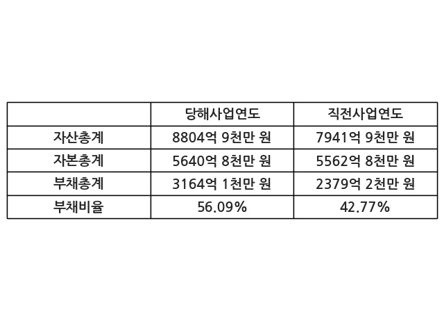 또한, 이번사업연도의 자산총계는 8804억 9천만 원으로 직전사업연도 대비 10.87% 증가한 한편, 부채총계는 3164억 1천만 원으로 32.99% 증가, 자본총계는 5640억 8천만 원으로 1.4% 증가했다.