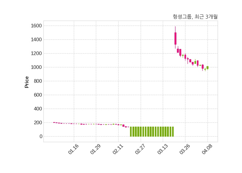 한편, 헝셩그룹은 장 마감 이후 해당 기업공시를 발표했으며 오늘 종가가 1,013원, 거래량은 333,503주로, 직전 거래일 대비 38원(+3.9%) 상승했다.