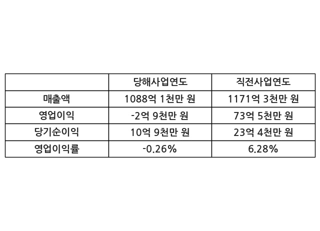 이번사업연도의 매출액은 직전사업연도 대비 -7.11% 감소한 1088억 1천만 원, 영업이익은 -2억 9천만 원, 당기순이익은 10억 9천만 원이라고 공시했다.