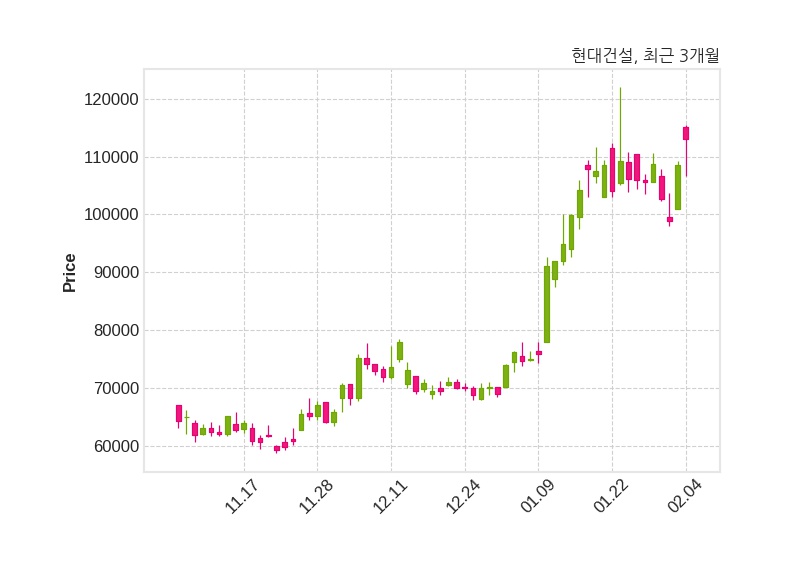 한편, 현대건설은 장 마감 이후 해당 기업공시를 발표했으며 오늘 종가가 113,000원, 거래량은 2,061,897주로, 직전 거래일 대비 4,400원(+4.05%) 상승했다.