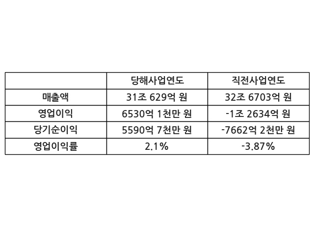 이번사업연도의 매출액은 직전사업연도 대비 -4.92% 감소한 31조 629억 원, 영업이익은 6530억 1천만 원, 당기순이익은 5590억 7천만 원이라고 공시했다.