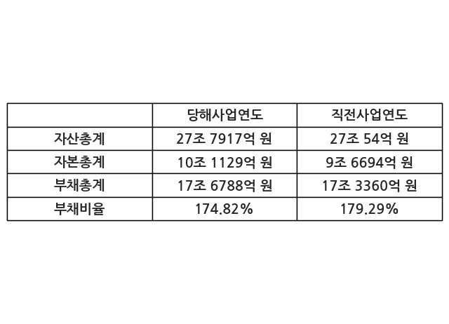 또한, 이번사업연도의 자산총계는 27조 7917억 원으로 직전사업연도 대비 2.91% 증가한 한편, 부채총계는 17조 6788억 원으로 1.98% 증가, 자본총계는 10조 1129억 원으로 4.59% 증가했다.