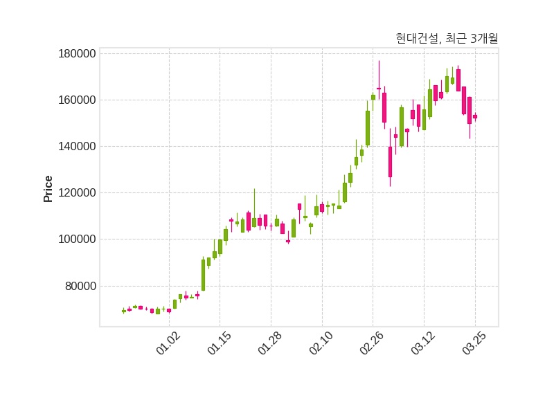 한편, 현대건설의 09시 25분 현재주가는 152,400원으로 직전 거래일 대비 2,500원(+1.67%) 상승이며, 거래량은 152,015주이다.
