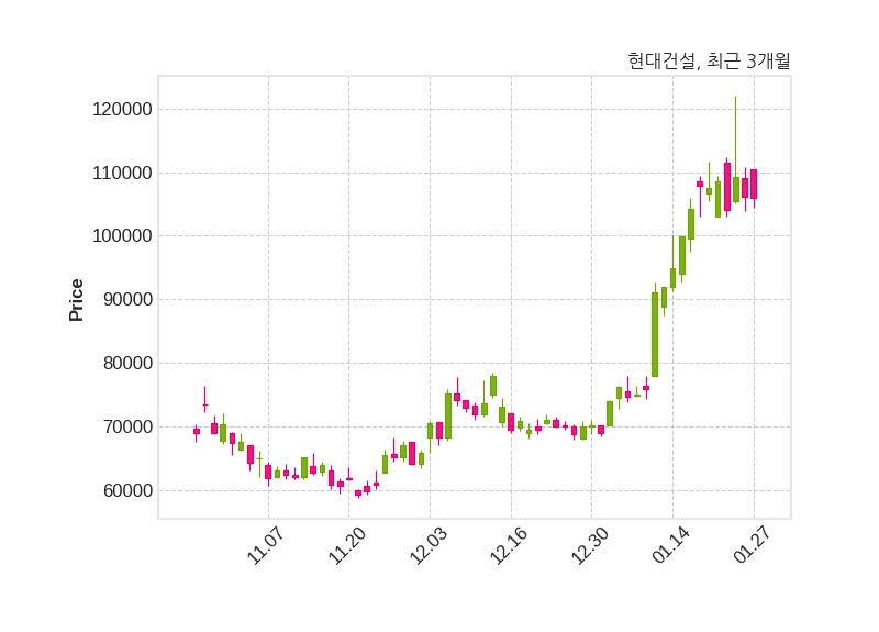 한편, 현대건설은 장 마감 이후 해당 기업공시를 발표했으며 오늘 종가가 105,900원, 거래량은 1,305,240주로, 직전 거래일 대비 300원(-0.28%) 하락했다.