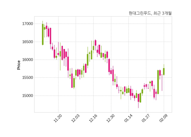 한편, 현대그린푸드의 14시 22분 현재주가는 15,760원으로 직전 거래일 대비 180원(+1.16%) 상승이며, 거래량은 68,286주이다.