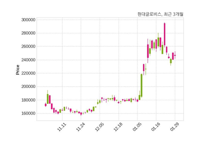 한편, 현대글로비스의 10시 32분 현재주가는 246,500원으로 직전 거래일 대비 6,000원(+2.49%) 상승이며, 거래량은 336,425주이다.