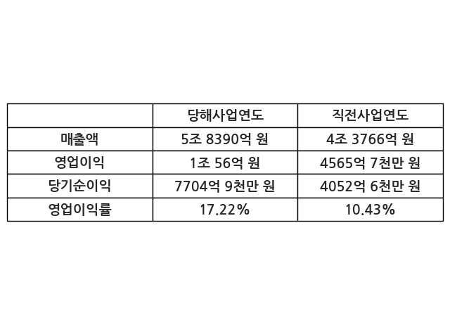 이번사업연도의 매출액은 직전사업연도 대비 33.41% 증가한 5조 8390억 원, 영업이익은 1조 56억 원, 당기순이익은 7704억 9천만 원이라고 공시했다.
