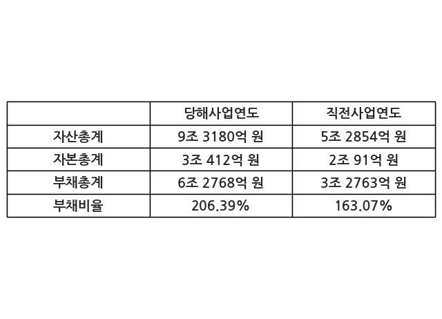 또한, 이번사업연도의 자산총계는 9조 3180억 원으로 직전사업연도 대비 76.3% 증가한 한편, 부채총계는 6조 2768억 원으로 91.58% 증가, 자본총계는 3조 412억 원으로 51.37% 증가했다.