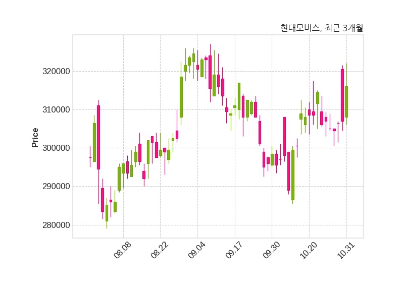한편, 현대모비스는 장 마감 이후 해당 기업공시를 발표했으며 오늘 종가가 316,000원, 거래량은 400,441주로, 직전 거래일 대비 9,000원(+2.93%) 상승했다.